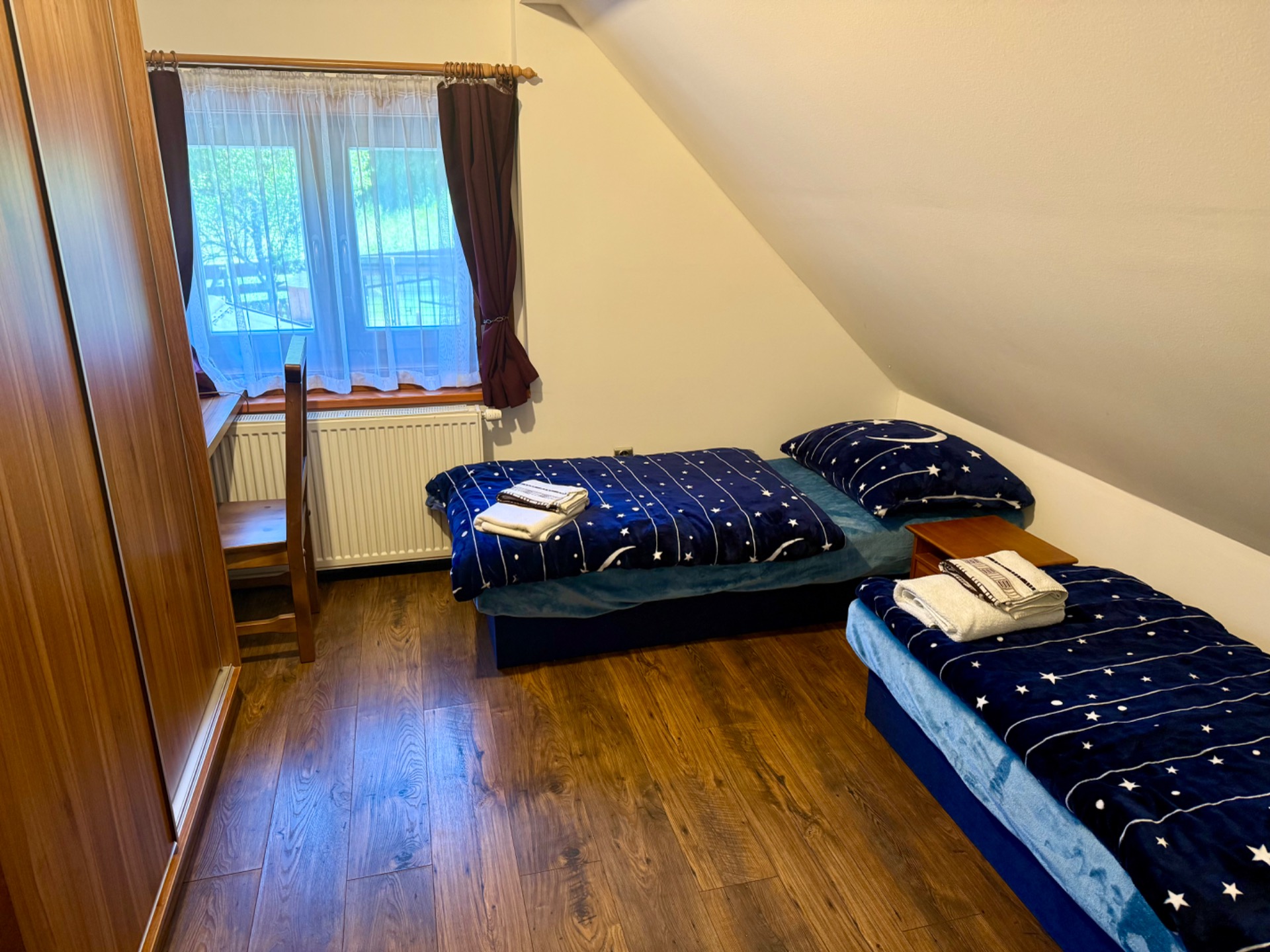COMFORT – celé horné poschodie vedľajšieho domu s dvomi irovnakými zbami, kúpeľňou a WC. V každej izbe sú vstavané posuvné skrine a pracovný kútik + kávovar a rychlovarná konvica.